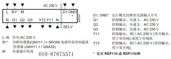 传感器输入用于自动冷/热转换或回风温度转换(配合使用温度传感器QAH11.1,仅限RDF110)